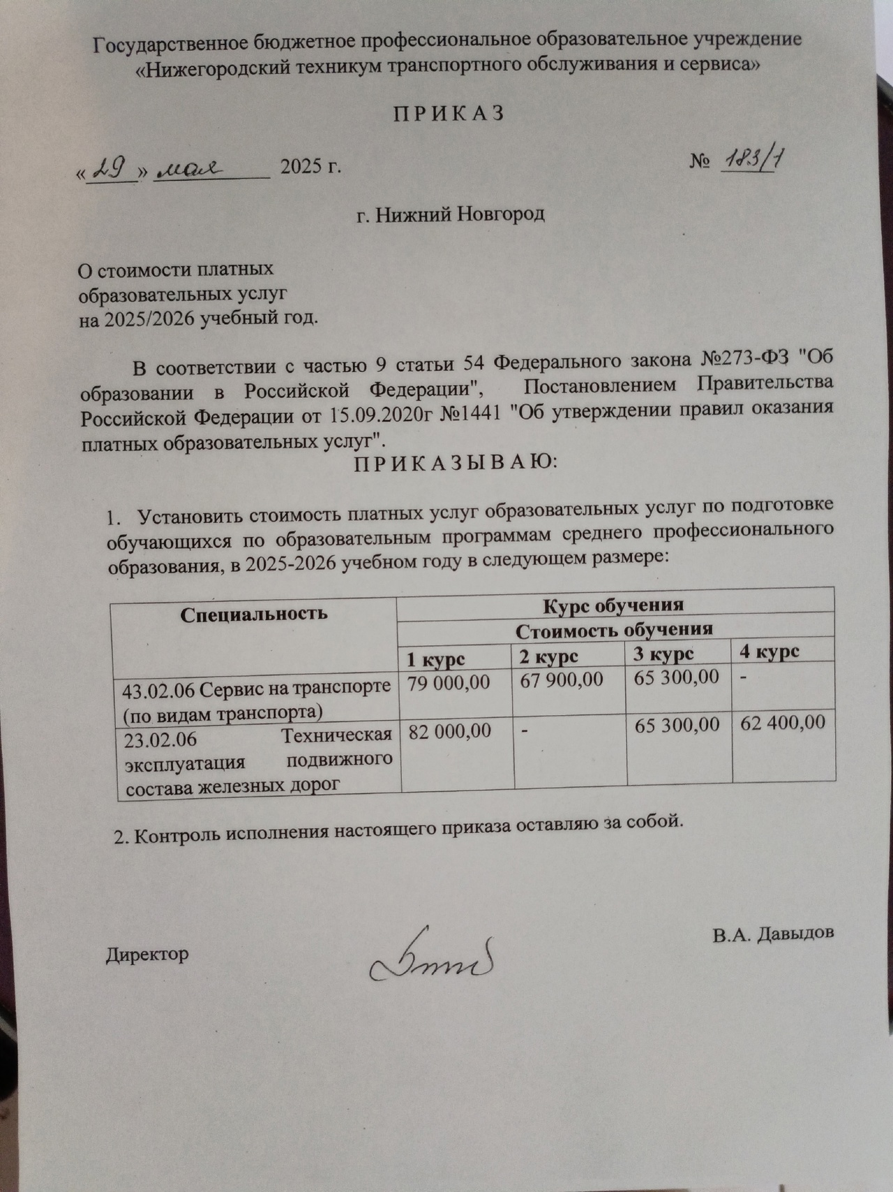 Стоимость обучения за 1 курс 2025/2026 уч.г. очного отделения по специальности 43.02.06 "Сервис на транспорте" составляет 79000,00 (Семьдесят девять тысяч ) рублей 00 копеек, по специальности 23.02.06 "Техническая эксплуатация подвижного состава железных дорог" составляет 82000,00 (Восемьдесят две тысячи ) рублей 00 копеек